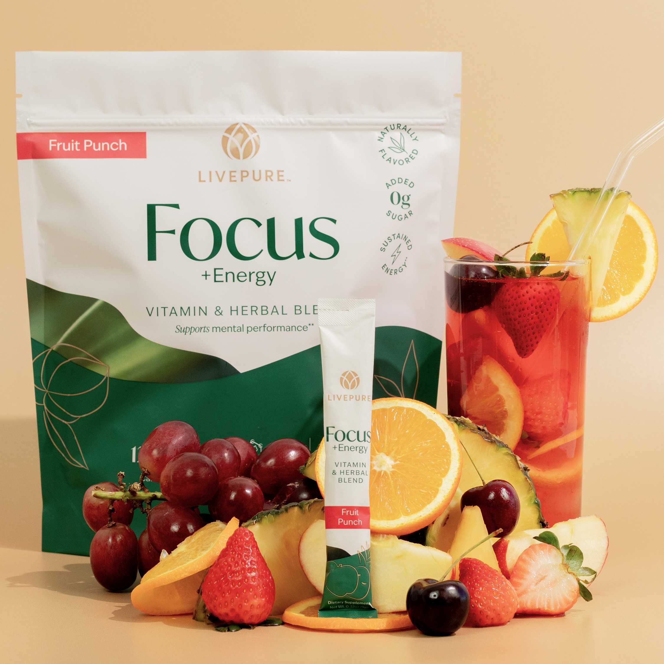 Focus + Energy is packed with antioxidants, botanicals, and natural sources of caffeine, making it the perfect alternative to sugar-laden, artificially sweetened energy drinks. A bright, feel-good flavor that tastes like pure sunshine. This Limited Edition Fruit Punch blend delivers bold, refreshing energy in every sip—now available in convenient stick packs.